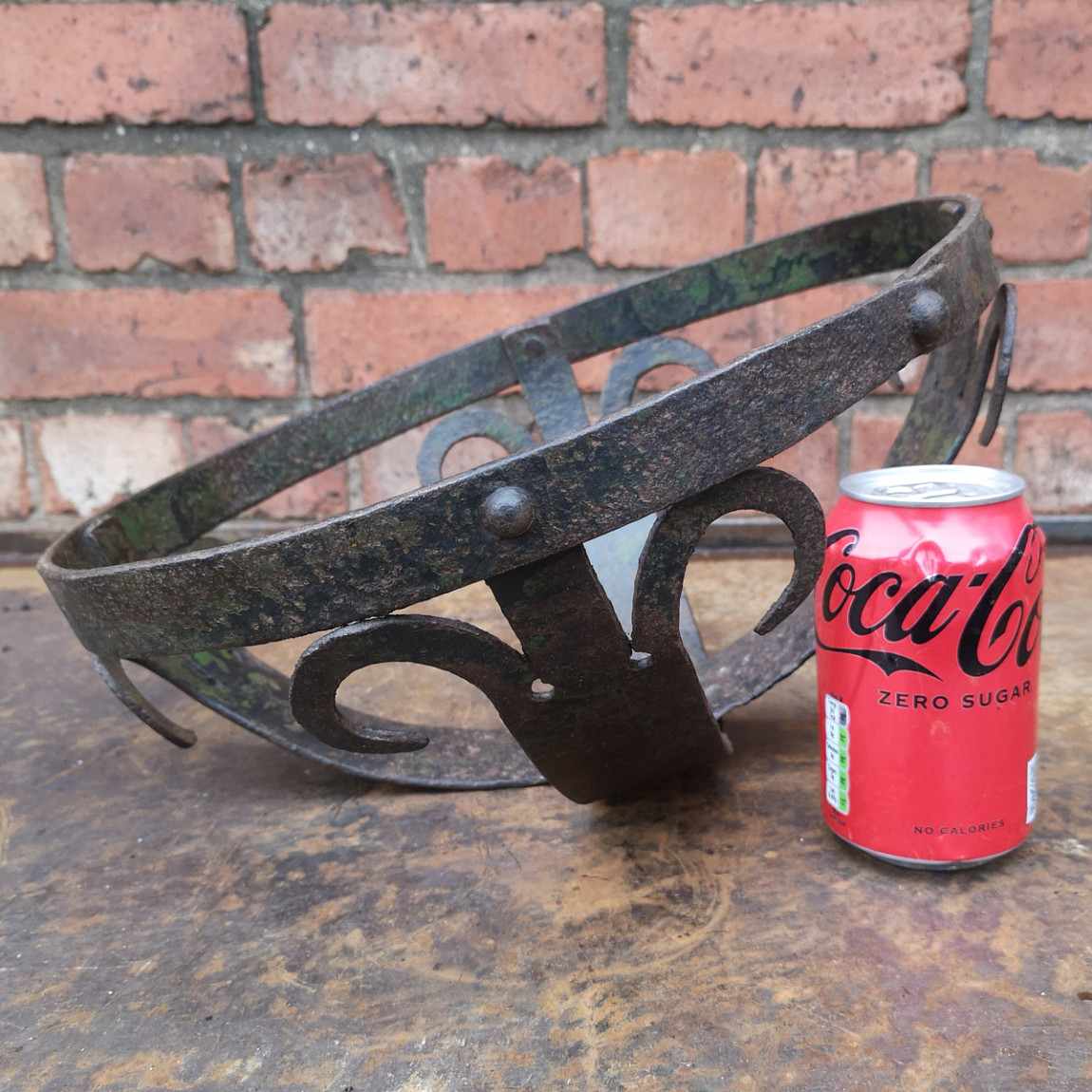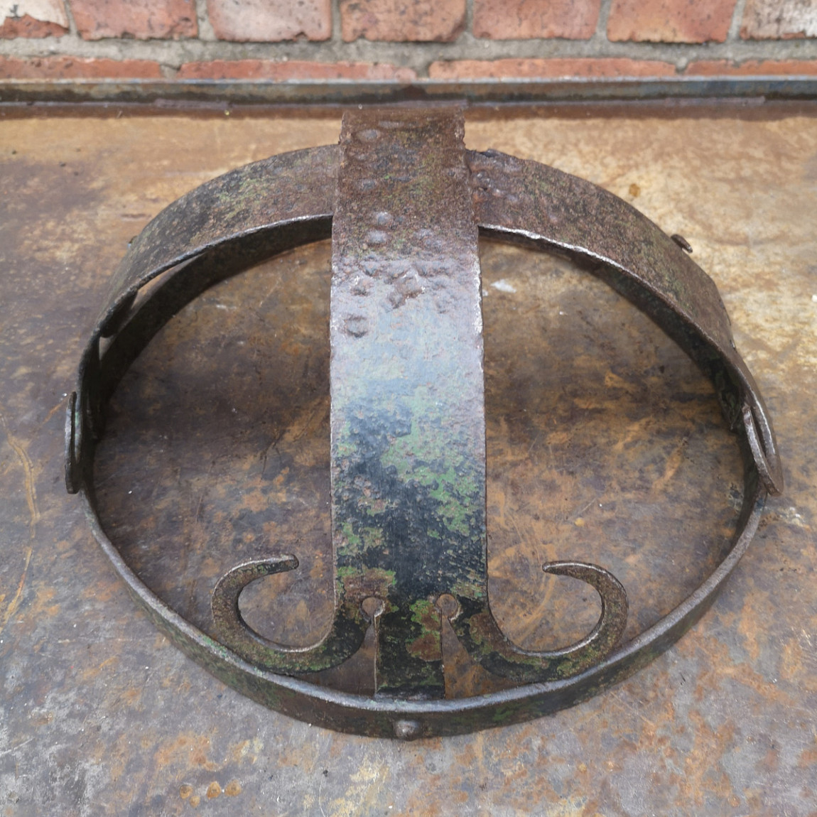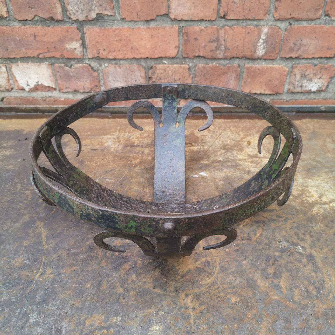 This is a very attractive vintage open semi-circular basket. It is handmade out of steel, skillfully constructed in the medieval style, and fixed with steel rivets. It is difficult to date and has no makers' marks that I can discover. It is nicely patinated and weathered. It may have originally held a terracotta or glass bowl and sat in an Iron stand. It now has many functional and decorative purposes.