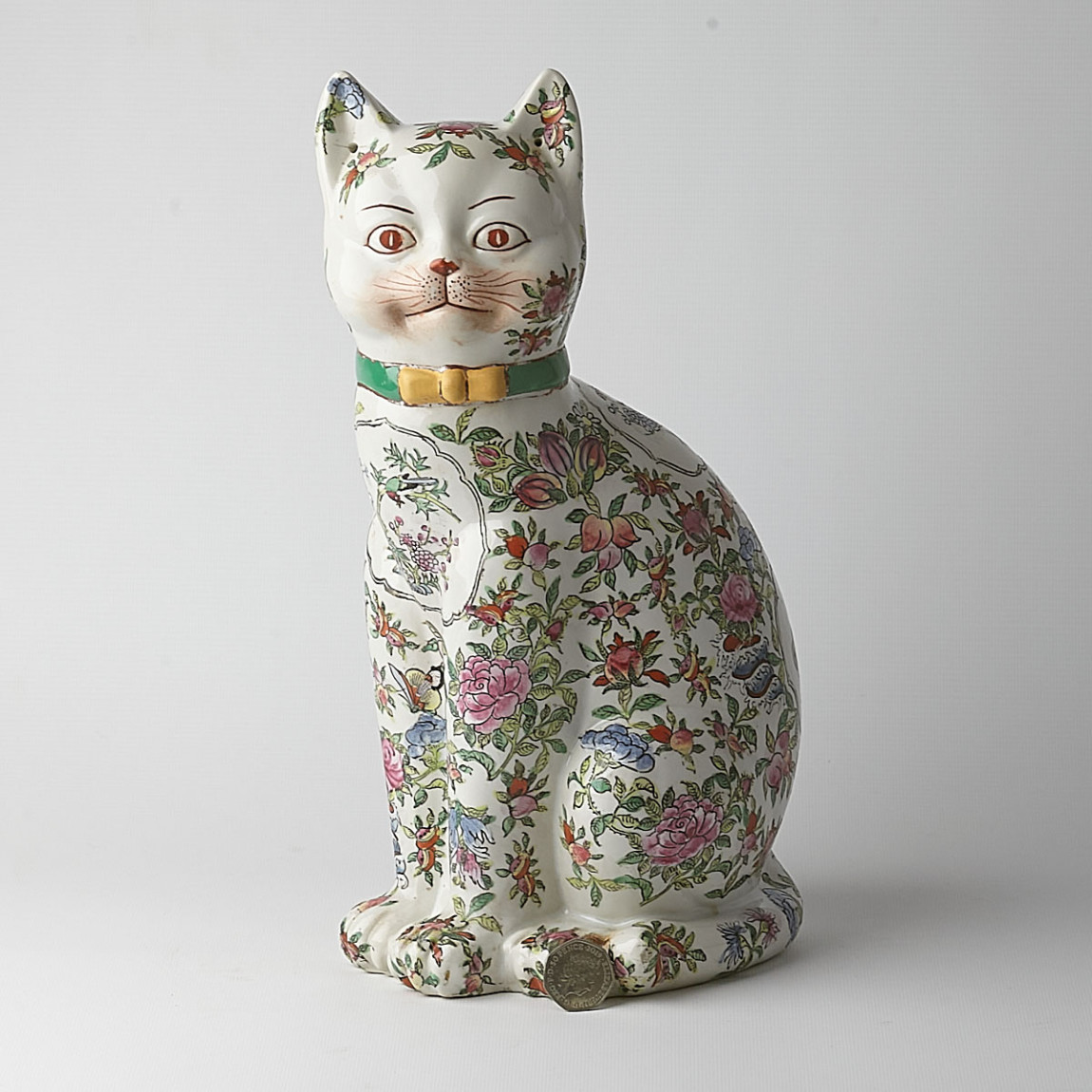 A large, handsome oriental Imari cat (damage to the rear). In the upright, sitting position, beautifully decorated with typical Imari floral design. The colour way features an abundance of large green, red and blue flowers, the green collar with yellow bow tie adding to her very pleasing colour balance. A six-character signature is present on the base.