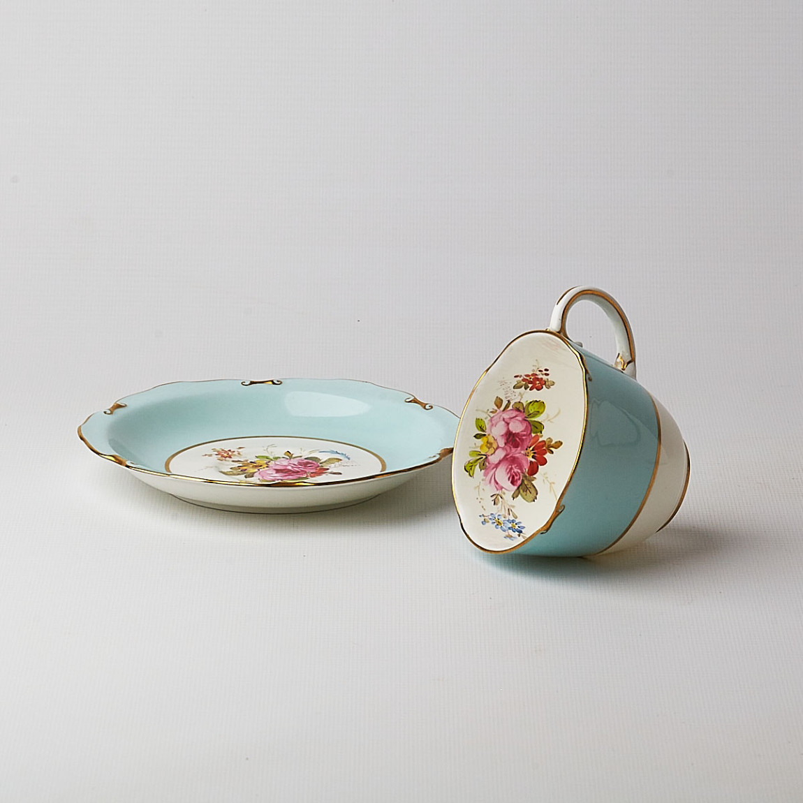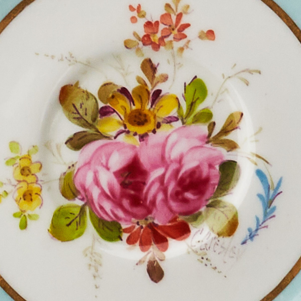 Near perfect and dating to the beginning of the1900s. This matching cup and saucer are in exquisite collectors' condition. Made of fine bone China in a soft fluted form with lightly embossed rims. The Royal Crown Derby factory, based in Derby, England, had a number of very talented artists at this time. The creator of the beautiful floral decoration on these pieces was delicately executed by their very best: the renowned artist Cuthbert Gresley. His fully signed work is of equal high quality on both cup and saucer and sits perfectly with the light blue Eau de Nil border and pure white fine bone China ground. The crisp, detailed gilding sets both pieces off perfectly.