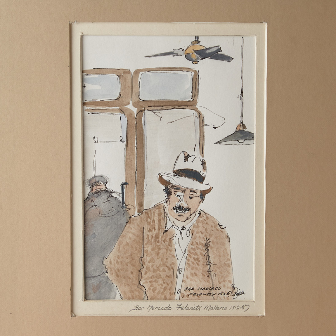 A lovely little ink and watercolour sketch of a man entering a bar in Majorca, Spain. In the loose and relaxed trade mark style of British artist Donald Smith, who produced a body of fine works and has exhibited in the Royal Academy London. This piece, dated 1987, has a wonderful muted/cool colour palette. It is in wonderful fresh condition with no damage or retouching and is free from stains, yellowing or foxing. It is nicely sealed, mounted and framed behind glass as it came to me.