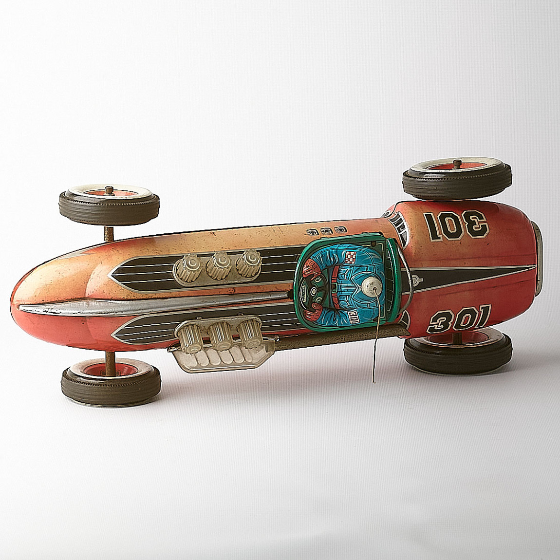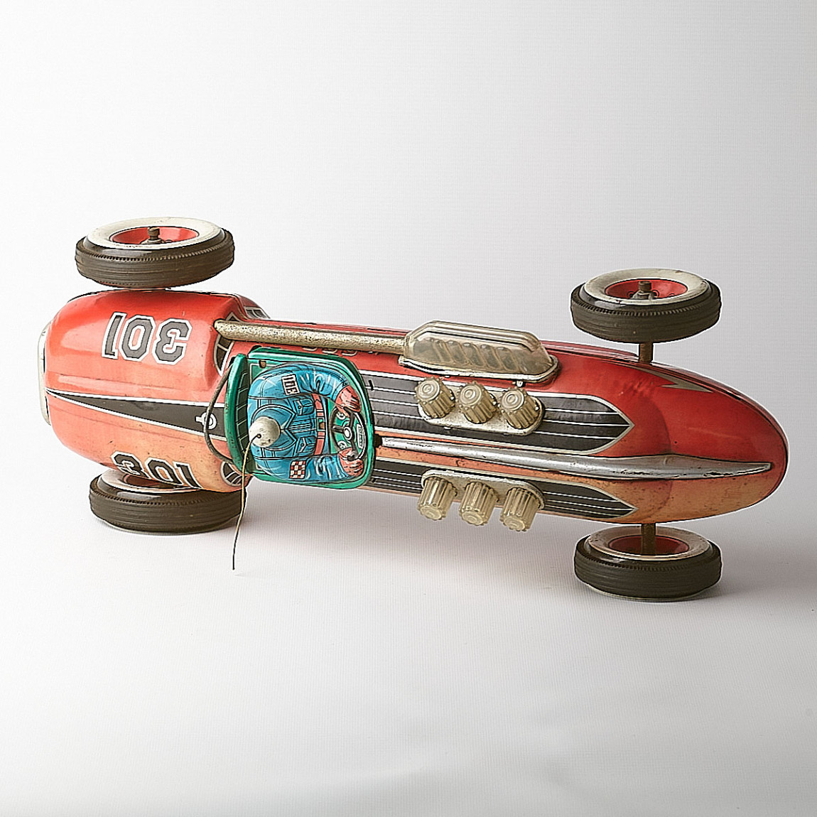 The impressive “Champion Racer 301” tin plate Japanese racing car. Manufactured by the Masudaya toy company of Japan. Bearing the trade mark of Modern toys and the patent numbers: 70819, 67160.